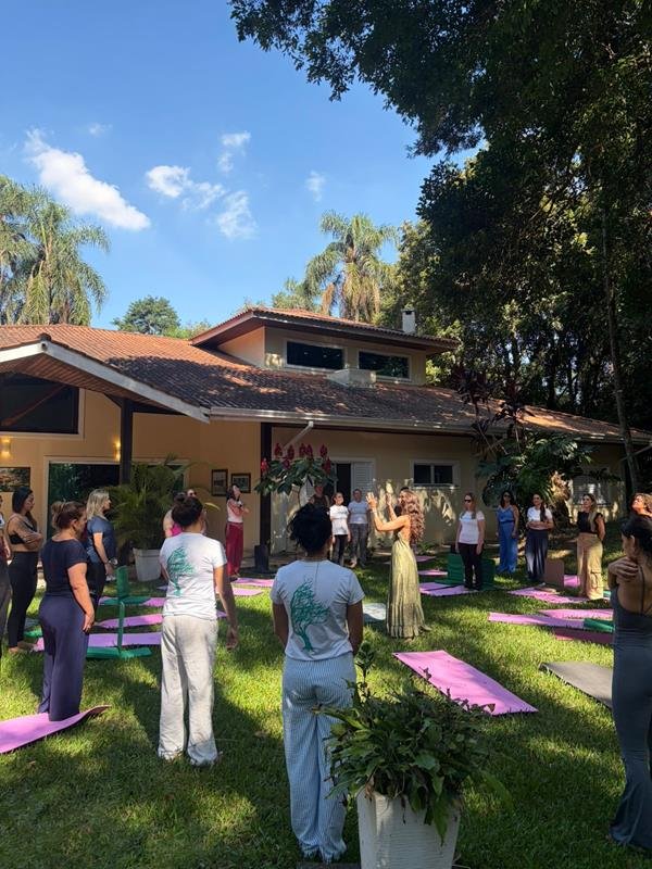 Ao longo de sete horas de programação, as participantes foram conduzidas por uma jornada cuidadosamente estruturada, que combinou yoga, práticas terapêuticas, palestras e experiências sensoriais. Desde a recepção com café leve até o encerramento em roda de partilha, cada momento foi pensado para estimular consciência, escuta interna e troca genuína.